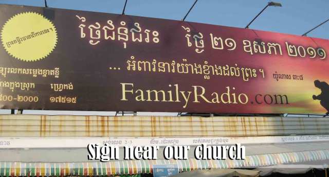 No doubt some of you have heard of the group in the States who have predicted that the Rapture will take place on May 21, 2011. There have always been groups who have tried to set dates etc… and we are somewhat accustomed to that type of thing in the Unites States. However, for the people here in Cambodia it causes great confusion. This sign is prominently posted above a popular market near our church. Many of the people in our neighborhood have seen the sign and some have asked about it. This sign says that “the Bible guarantees that May 21st is Judgment Day.” This type of thing causes so much confusion and no doubt the devil would like to use it to negate the message of the Gospel and the importance of people turning to Christ to be saved. It remains to be seen what long term damage this message could cause here in this country when May 21st comes and goes without “judgment” taking place. Then again, the Rapture could happen today! We need to be ready. There have been several different fringe groups from various parts of the world who have brought their false doctrines here to Cambodia. More than a decade ago a charismatic group came here and promised to heal everyone… Tens of thousands of people gathered into the sports stadium to be healed. When they finally understood that the preacher was a fraud they began a riot and the police had to escort him out of the country. Just three years ago a female charismatic “preacher” from America brought a large delegation here and caused great confusion. She also claimed that during the two days she was here that 50,000 Khmer were saved. So needless to say – Cambodia has had her share of confusion from various groups who claim to be Christian.